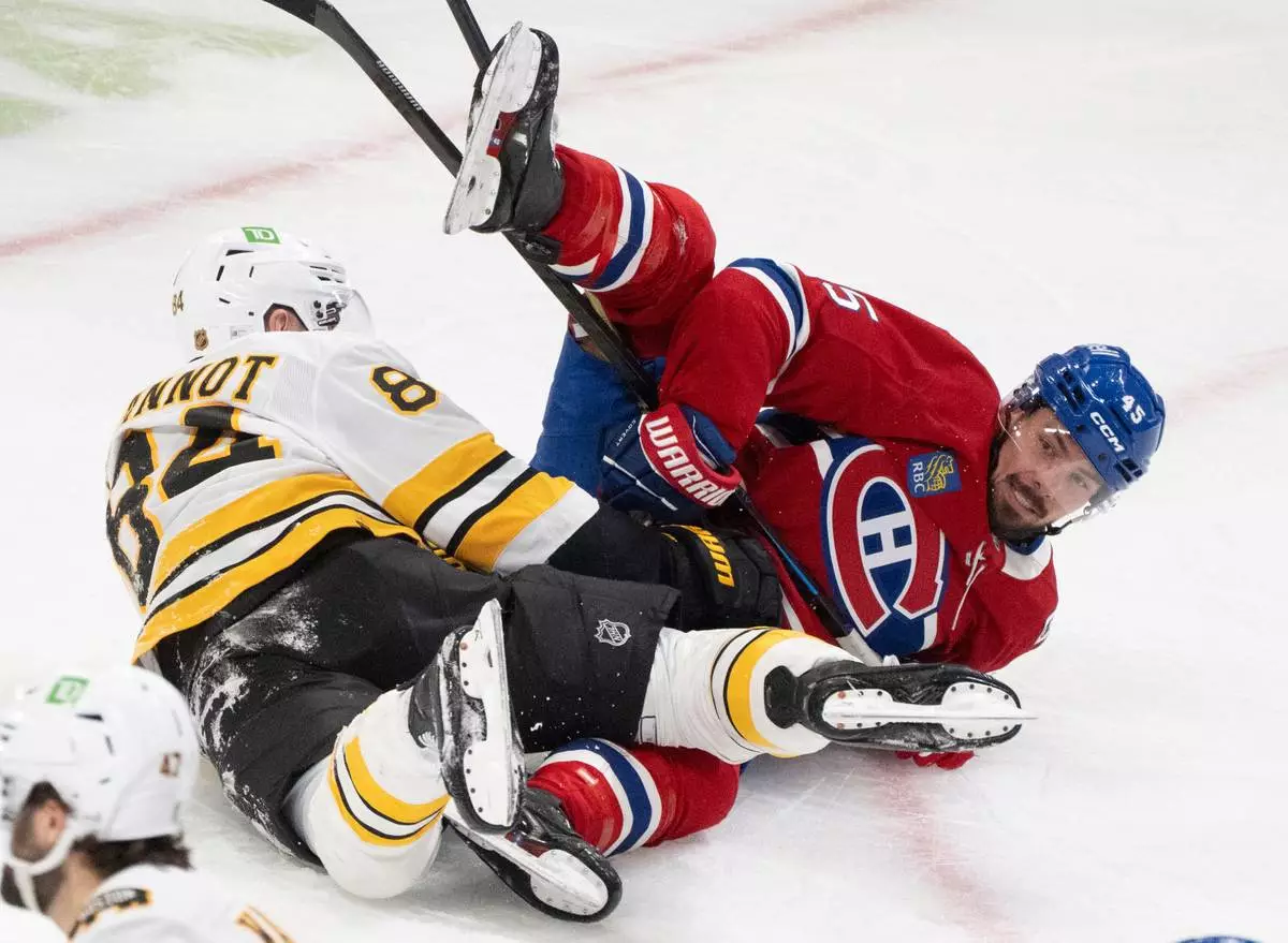 Montreal Canadiens' Alexandre Carrier (45) and Boston Bruins' Tanner Jeannot (84) get tangled up during second period NHL hockey action in Montreal, on Tuesday, March 17, 2026. (Christinne Muschi/The Canadian Press via AP)