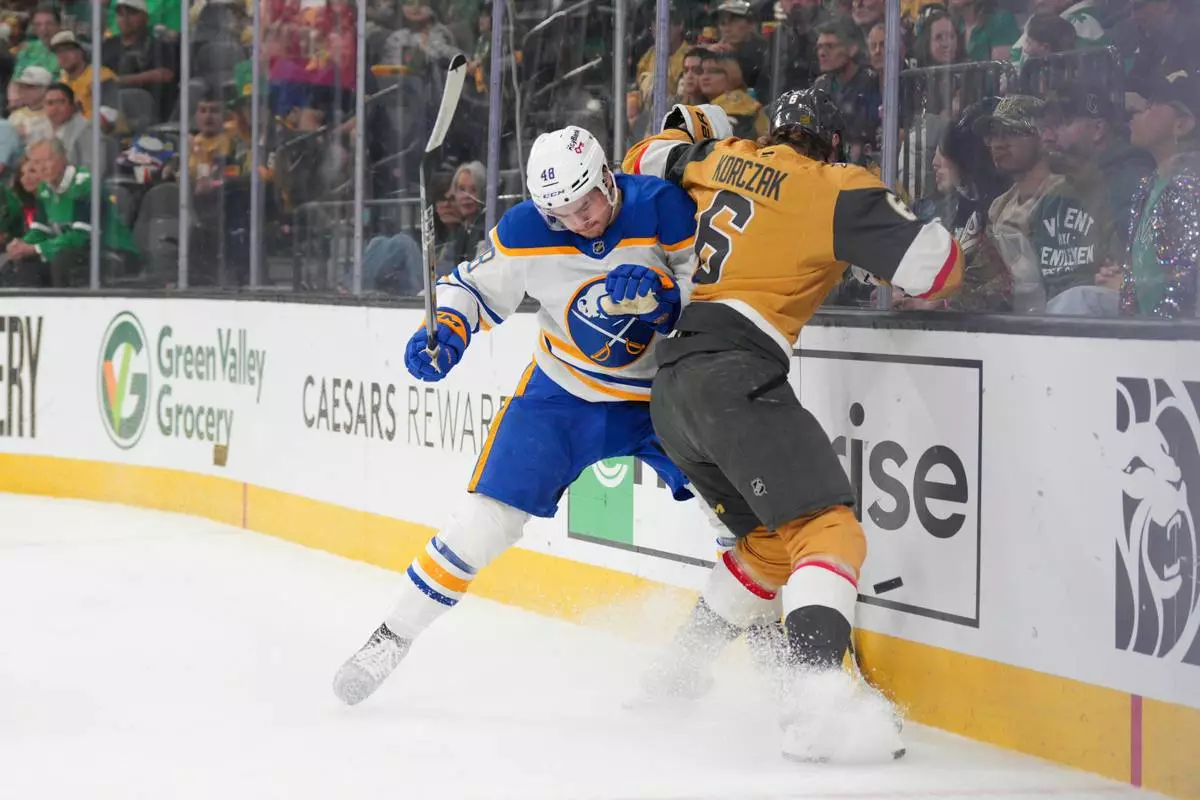 Buffalo Sabres center Tyson Kozak (48) collides with Vegas Golden Knights defenseman Kaedan Korczak (6) during the first period of an NHL hockey game Tuesday, March 17, 2026, in Las Vegas. (AP Photo/Candice Ward)