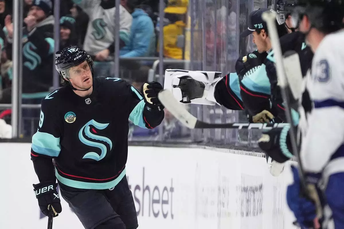 Seattle Kraken left wing Jared McCann celebrates his goal against the Tampa Bay Lightning with the bench during the second period of an NHL hockey game Tuesday, March 17, 2026, in Seattle. (AP Photo/Lindsey Wasson)