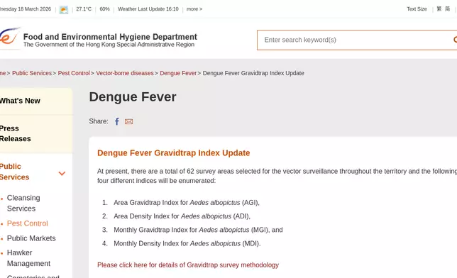 The Food and Environmental Hygiene Department (FEHD) today (March 18) released the third batch of gravidtrap indexes and density indexes for Aedes albopictus in March, covering 19 survey areas, as follows: