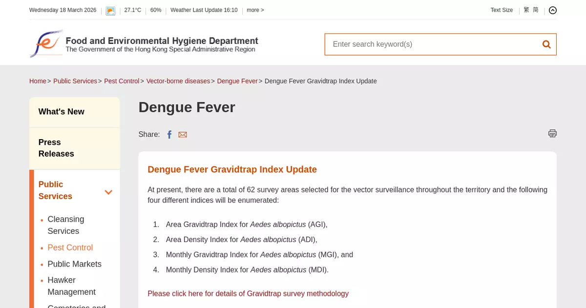 Following recommendations from the World Health Organization and taking into account the local situation in Hong Kong, the FEHD sets up gravidtraps in districts where mosquito-borne diseases have been recorded in the past, as well as in densely populated places such as housing estates, hospitals and schools to monitor the breeding and distribution of Aedes albopictus mosquitoes, which can transmit CF and dengue fever. At present, the FEHD has set up gravidtraps in 62 survey areas of the community, with a surveillance period of two weeks. During the surveillance period, the FEHD will collect the gravidtraps once a week. After the first week of surveillance, the FEHD will immediately examine the glue boards inside the retrieved gravidtraps for the presence of adult Aedine mosquitoes to compile the Gravidtrap Index (First Phase) and Density Index (First Phase). At the end of the second week of surveillance, the FEHD will instantly check the glue boards for the presence of adult Aedine mosquitoes. Data from the two weeks of surveillance will be combined to obtain the Area Gravidtrap Index and the Area Density Index. The gravidtrap and density indexes for Aedes albopictus in different survey areas, as well as information on mosquito prevention and control measures, are available on the department's webpage (www.fehd.gov.hk/english/pestcontrol/dengue_fever/Dengue_Fever_Gravidtrap_Index_Update.html#).