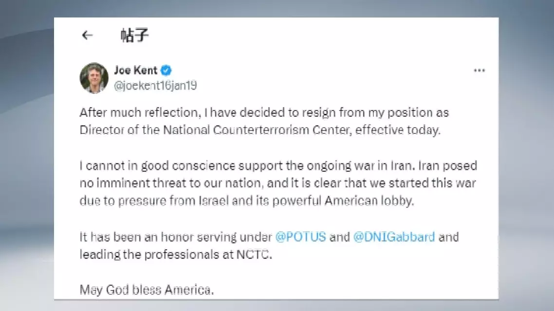 Kent said in a post on social media platform X that he "cannot in good conscience support the ongoing war in Iran."
