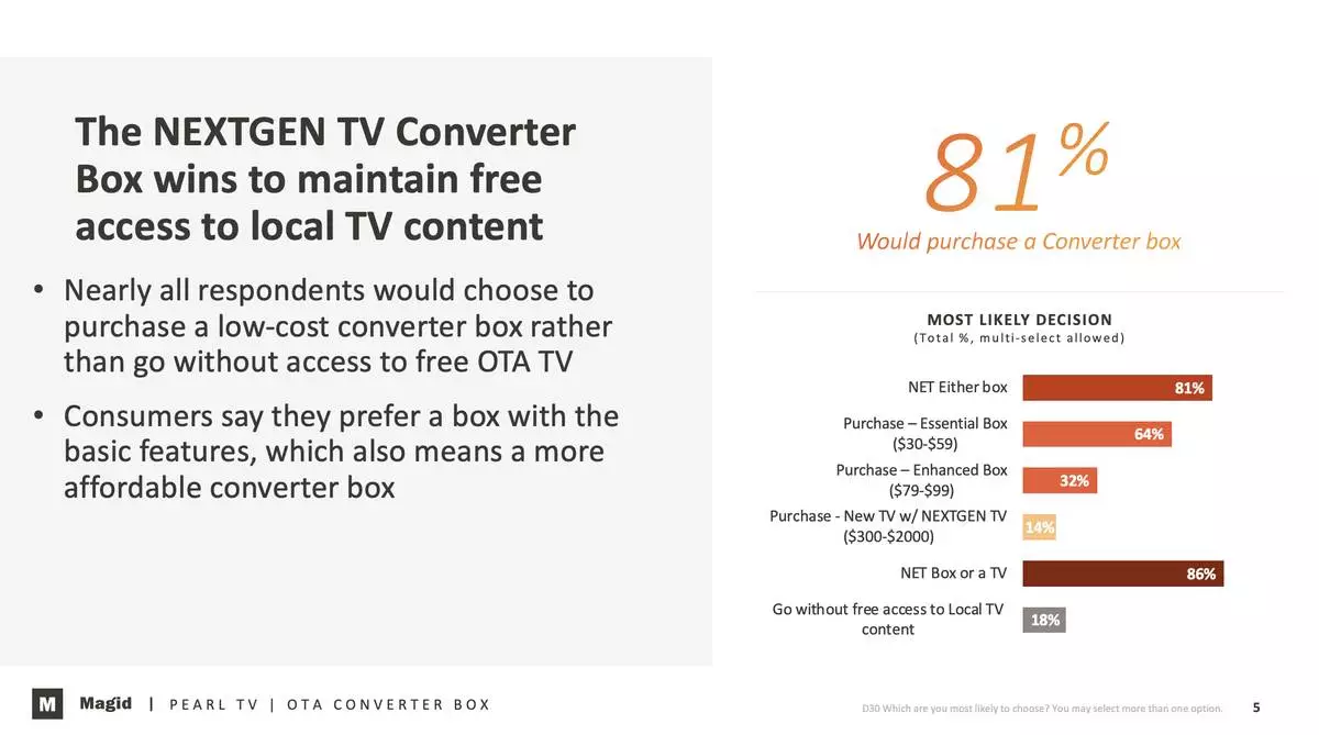 “This report highlights the evolution of the American consumer and the local television landscape, “Bill Hague, Executive Vice President at Magid, said. “We have been researching the benefits of NEXTGEN TV with U.S. consumers with Pearl TV for more than 10 years and one key finding of this study is that the younger end of the adult 25–64-year-old sample was most interested in the converter box.”