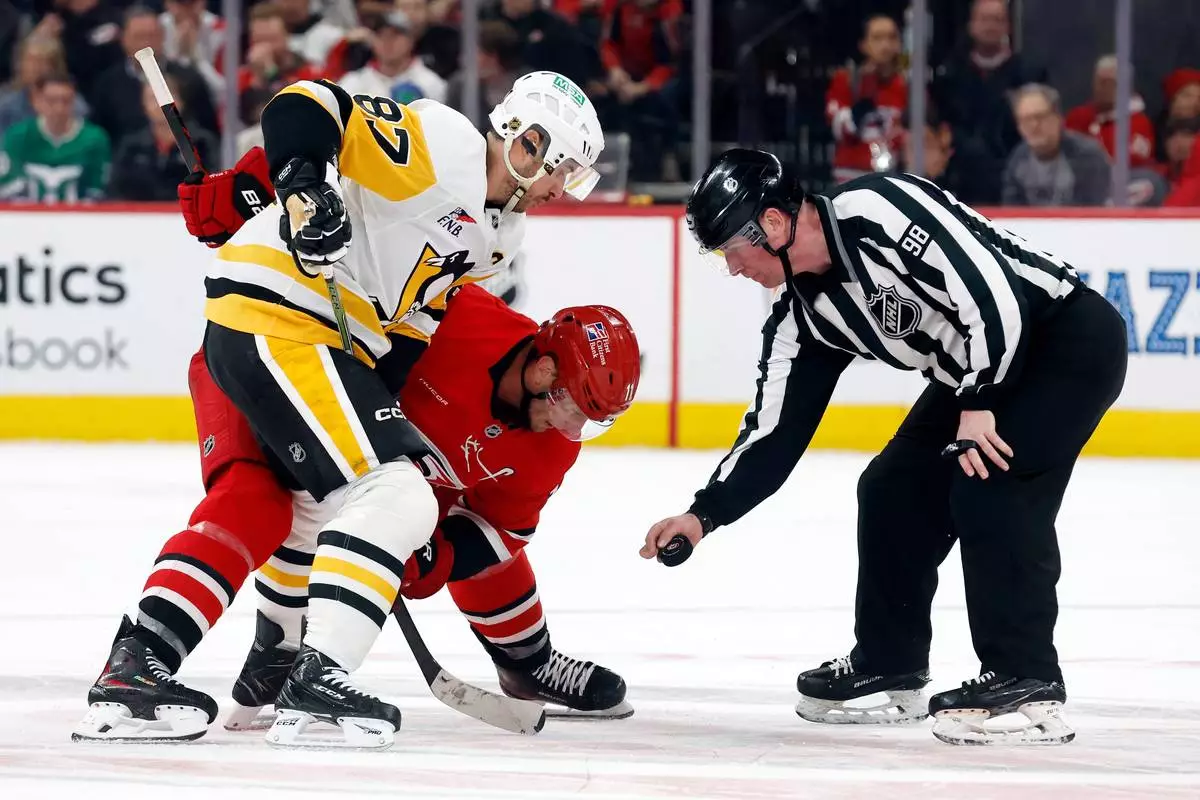 Carolina Hurricanes' Jordan Staal (11) faces off the overtime period against Pittsburgh Penguins' Sidney Crosby (87) with linesman Dan Kelly (98) holding the puck during the third period of an NHL hockey game in Raleigh, N.C., Wednesday, March 18, 2026. (AP Photo/Karl DeBlaker)