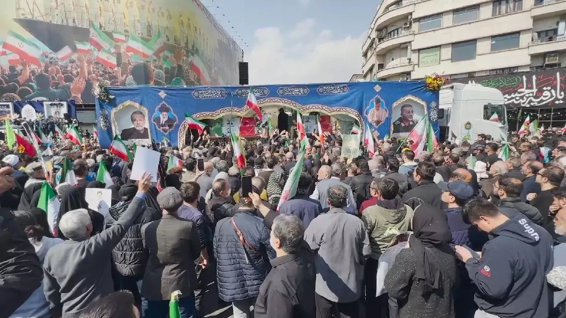 Mourners waved Iranian flags and held aloft pictures of leading officials killed in recent strikes, including the country's Supreme Leader Ali Khamenei who was killed on the first day of U.S.-Israeli attacks on Iran.