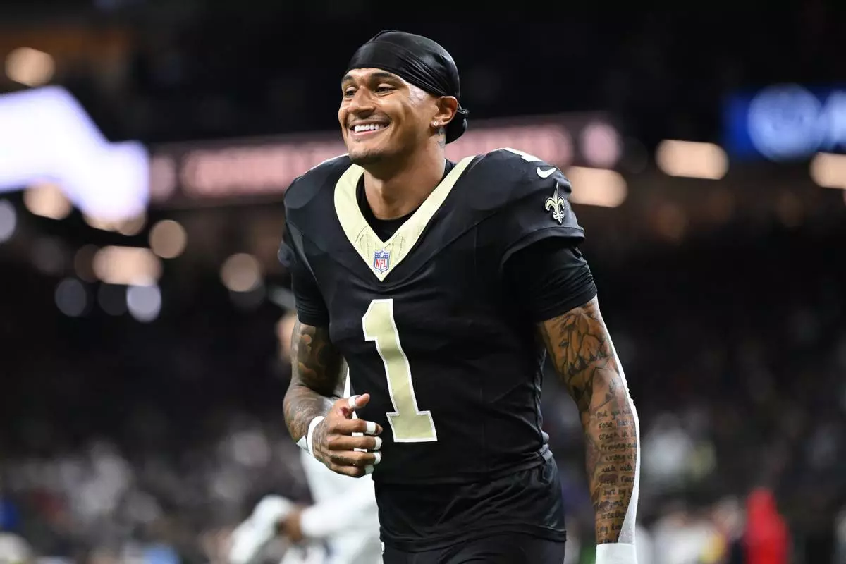 FILE- New Orleans Saints cornerback Alontae Taylor runs off the field before an NFL football game against the New England Patriots, Oct. 12, 2025, in New Orleans. (AP Photo/Ella Hall, File)
