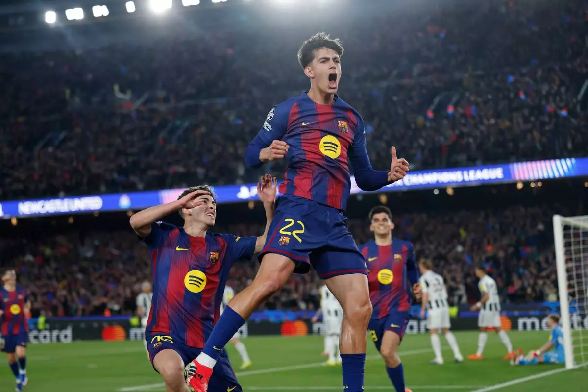 Barcelona's Marc Bernal celebrates after scoring his side's second goal during the Champions League round of 16, second leg soccer match between FC Barcelona and Newcastle United FC in Barcelona, Spain, Wednesday, March 18, 2026. (AP Photo/Joan Monfort)