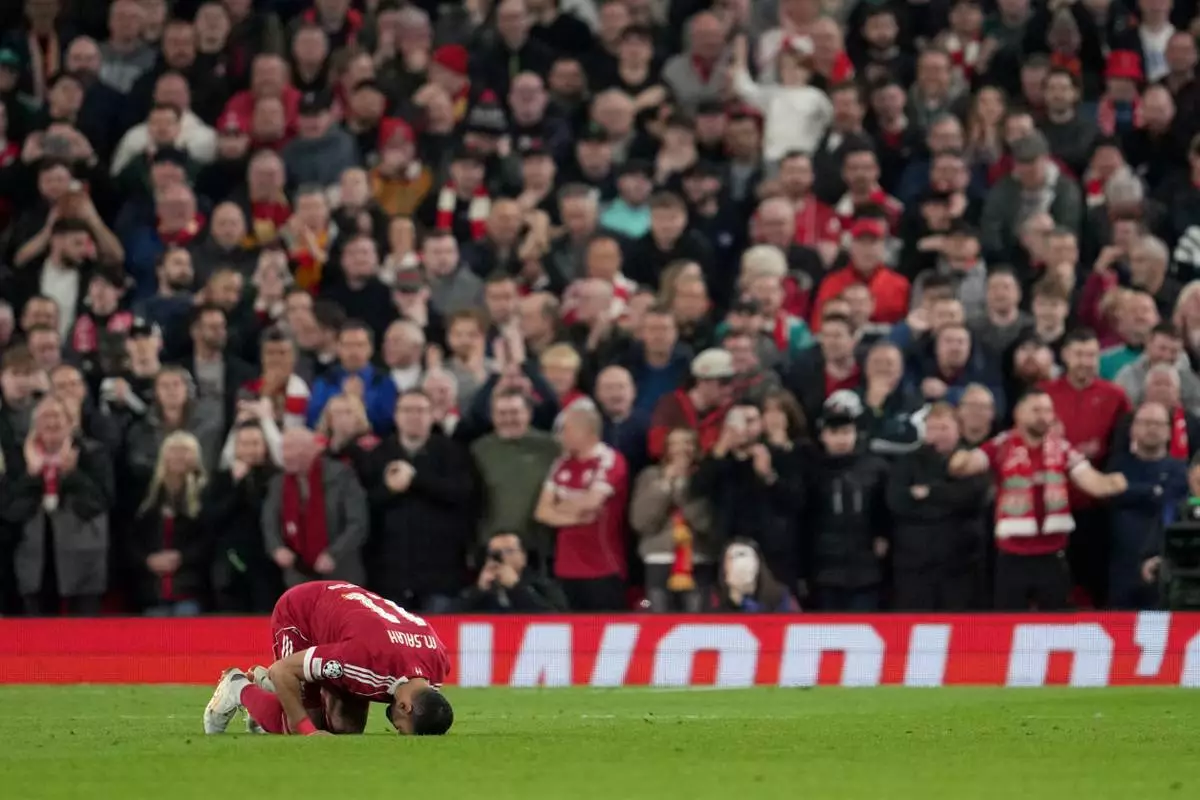 Liverpool's Mohamed Salah celebrates after scoring his side's fourth goal during the second leg of the Champions League round of 16 soccer match between Liverpool and Galatasaray, in Liverpool, England, Wednesday, March 18, 2026. (AP Photo/Jon Super)