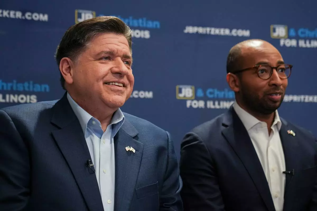 Illinois Gov. JB Pritzker with running mate, for lieutenant governor, Christian Mitchell speaks during an interview, Wednesday, March 18, 2026, in Chicago. (AP Photo/Erin Hooley)