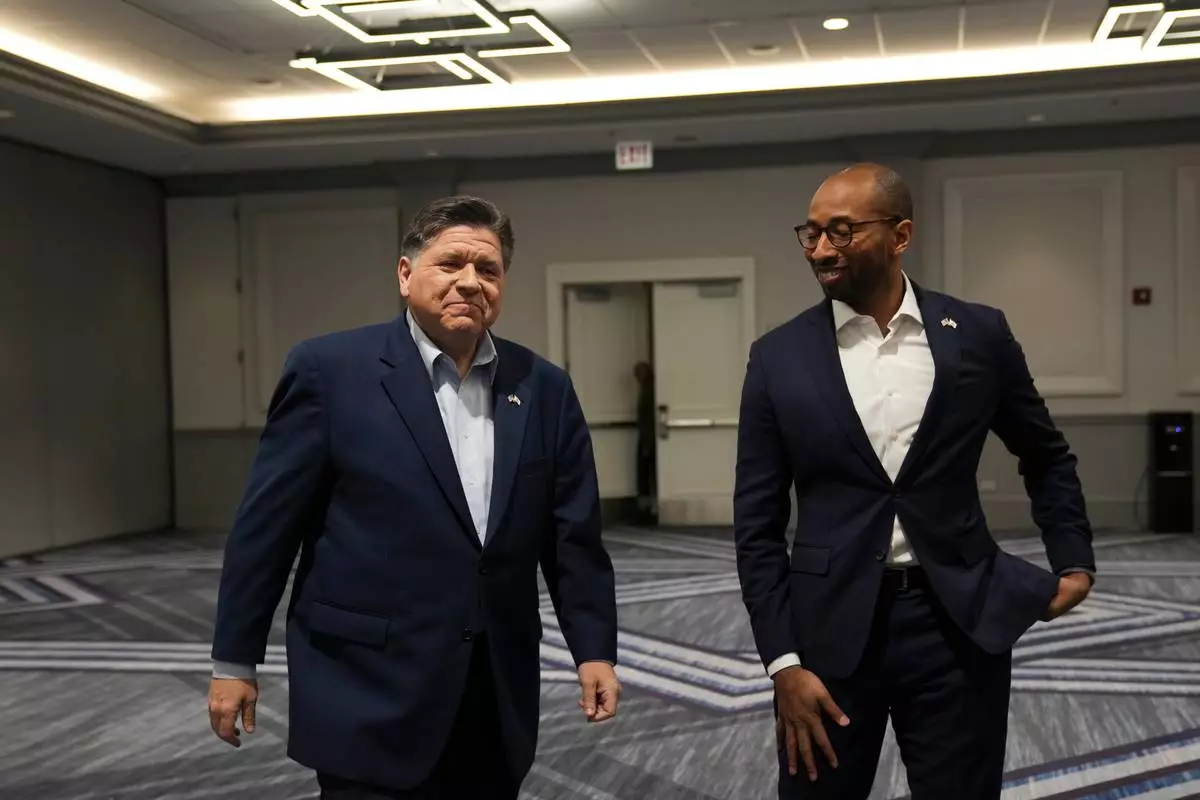 Illinois Gov. JB Pritzker, left, and running mate for lieutenant governor Christian Mitchell arrive for an interview, Wednesday, March 18, 2026, in Chicago. (AP Photo/Erin Hooley)