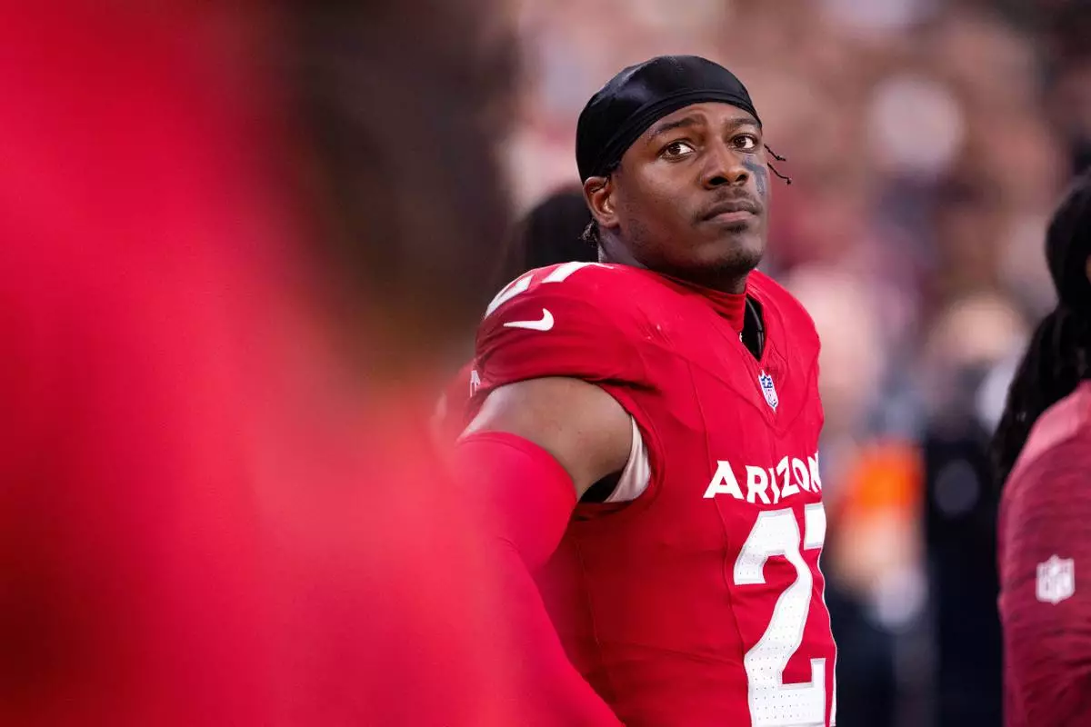 FILE - Arizona Cardinals linebacker Akeem Davis-Gaither looks on before an NFL football game against the Jacksonville Jaguars, Nov. 23, 2025, in Glendale, Ariz. (AP Photo/Samantha Chow, File)