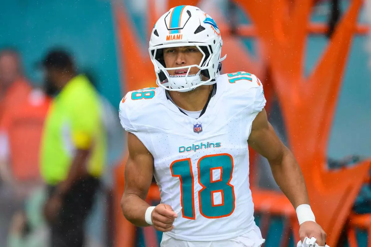 FILE - Miami Dolphins wide receiver Nick Westbrook-Ikhine (18) runs onto the field during player introductions before an NFL football game against the New Orleans Saints, Nov. 30, 2025, in Miami Gardens, Fla. (AP Photo/Doug Murray, File)