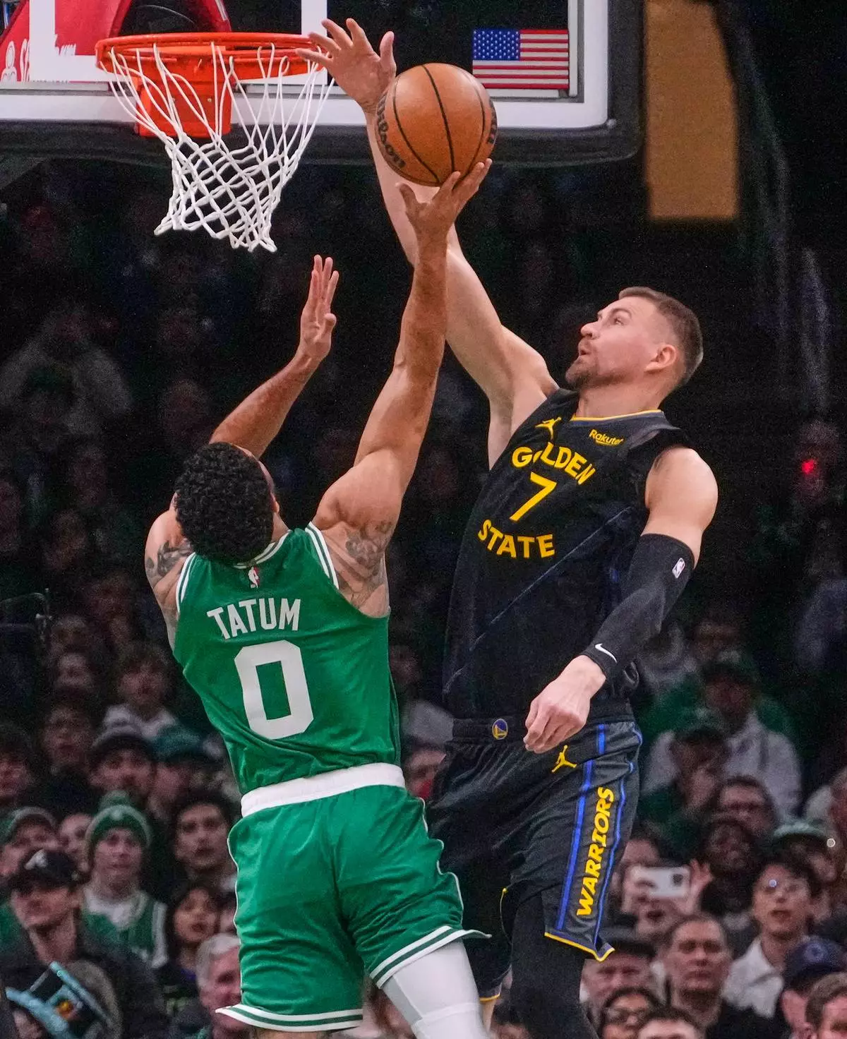 Golden State Warriors center Kristaps Porzingis (7) blocks a shot by Boston Celtics forward Jayson Tatum (0) during the first half of an NBA basketball game, Wednesday, March 18, 2026, in Boston. (AP Photo/Charles Krupa)