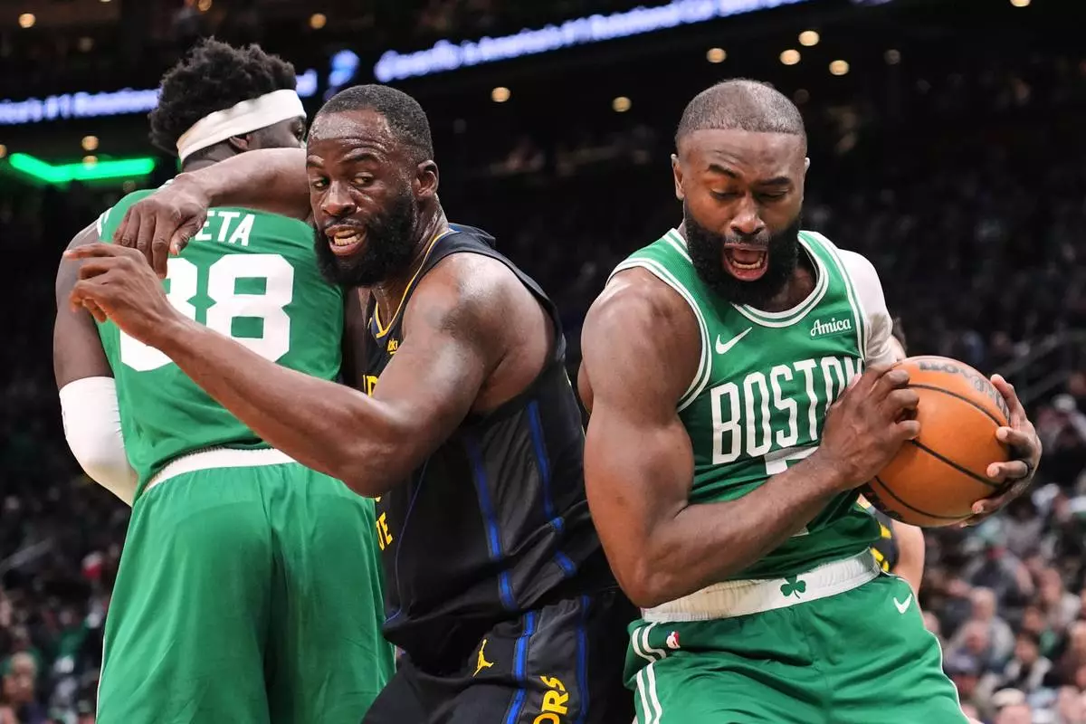 Boston Celtics guard Jaylen Brown, right, grabs a rebound against Golden State Warriors forward Draymond Green (23) during the first half of an NBA basketball game, Wednesday, March 18, 2026, in Boston. (AP Photo/Charles Krupa)