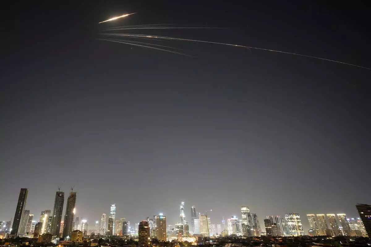 Missiles launched from Iran streak across the sky over central Israel, Wednesday, March 18, 2026. (AP Photo/Ohad Zwigenberg)
