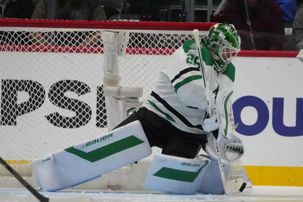 Dallas Stars goaltender Jake Oettinger makes a stick save in the second period of an NHL hockey game against the Colorado Avalanche Wednesday, March 18, 2026, in Denver. (AP Photo/David Zalubowski)