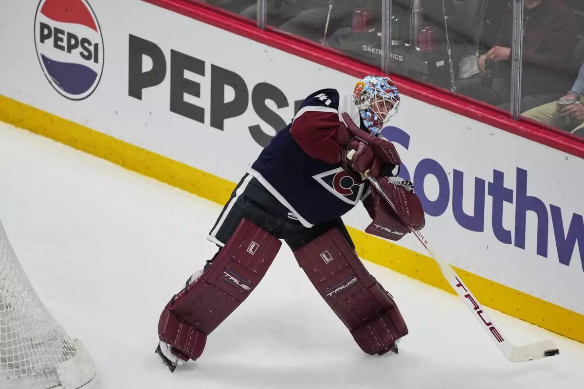Colorado Avalanche goaltender Scott Wedgewood clears the puck in the first period of an NHL hockey game against the Dallas Stars, Wednesday, March 18, 2026, in Denver. (AP Photo/David Zalubowski)