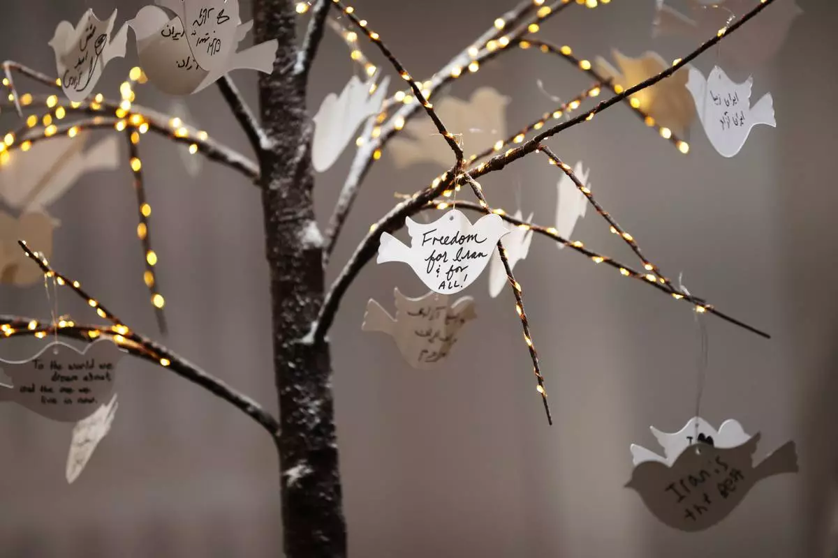 Hand written messages are posted on a tree, part of a dedicated memorial space for the lives lost in Iran, during a gathering in New York, on Saturday, March 14, 2026, for the upcoming Nowruz, Iranian/Persian New Year's day. (AP Photo/Heather Khalifa)