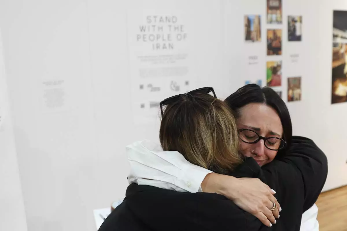 Forough Jafari hugs a visitor at a dedicated memorial space for the lives lost in Iran during a gathering in New York, on Saturday, March 14, 2026, for the upcoming Nowruz, Iranian/Persian New Year's day. (AP Photo/Heather Khalifa)