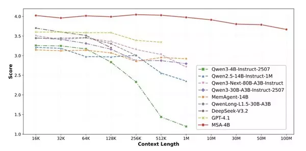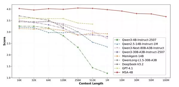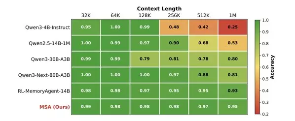 The research introduces a novel memory architecture called MSA (Memory Sparse Attention). Through a combination of the Memory Sparse Attention mechanism, Document-wise RoPE for extreme context extrapolation, KV Cache Compression with Memory Parallelism, and a Memory Interleave mechanism supporting complex reasoning, MSA achieves a 100-million-token long-term memory framework for LLMs. It delivers industry-leading results on mainstream long-context QA and Needle-In-A-Haystack (NIAH) benchmarks. Remarkably, when scaling the context length from 16K to 100M tokens, the model's performance degrades by less than 9%, demonstrating extraordinary scalability.