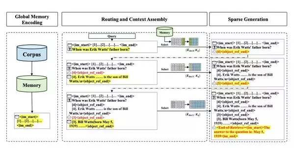 This iterative reasoning chain simulates the thought process of a human detective: "Discover clue A → Follow the vine to find clue B → Integrate A and B to form a complete evidence chain." It endows MSA with the ability to dynamically plan its information-gathering path, which is a crucial reason for its outstanding performance on Multi-hop QA tasks. The model autonomously determines how many retrieval rounds are needed per query, rather than relying on a pre-defined fixed number of retrieved documents.