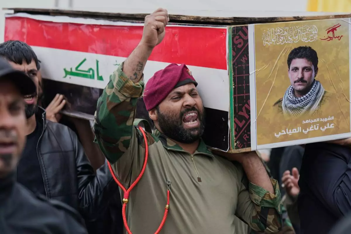 Members from the Popular Mobilization Forces attend the funeral of fighters who were killed, according to their statement, in a U.S.-Israel airstrike, in Baghdad, Iraq, Thursday, March 19, 2026. (AP Photo/Hadi Mizban)