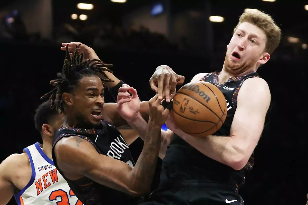 Brooklyn Nets center Nic Claxton, left, and teammate Danny Wolf, right, both go for the rebound during the second half of an NBA basketball game against the New York Knicks, Friday, March 20, 2026, in New York. (AP Photo/Heather Khalifa)