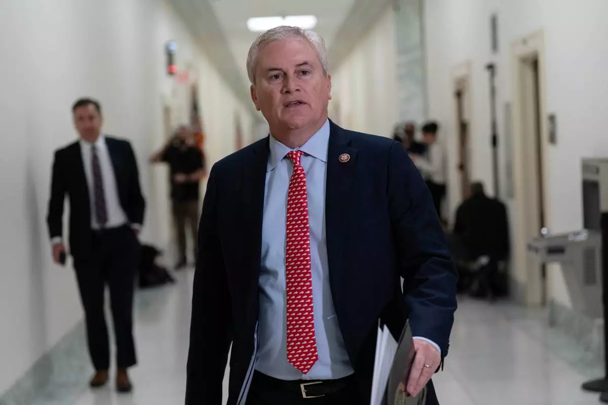 House Oversight Committee Chairman James Comer, R-Ky., walks to talk to the press as he arrives for Darren K. Indyke deposition before the House Oversight Committee on Capitol Hill, Thursday, March 19, 2026, in Washington. (AP Photo/Jose Luis Magana)