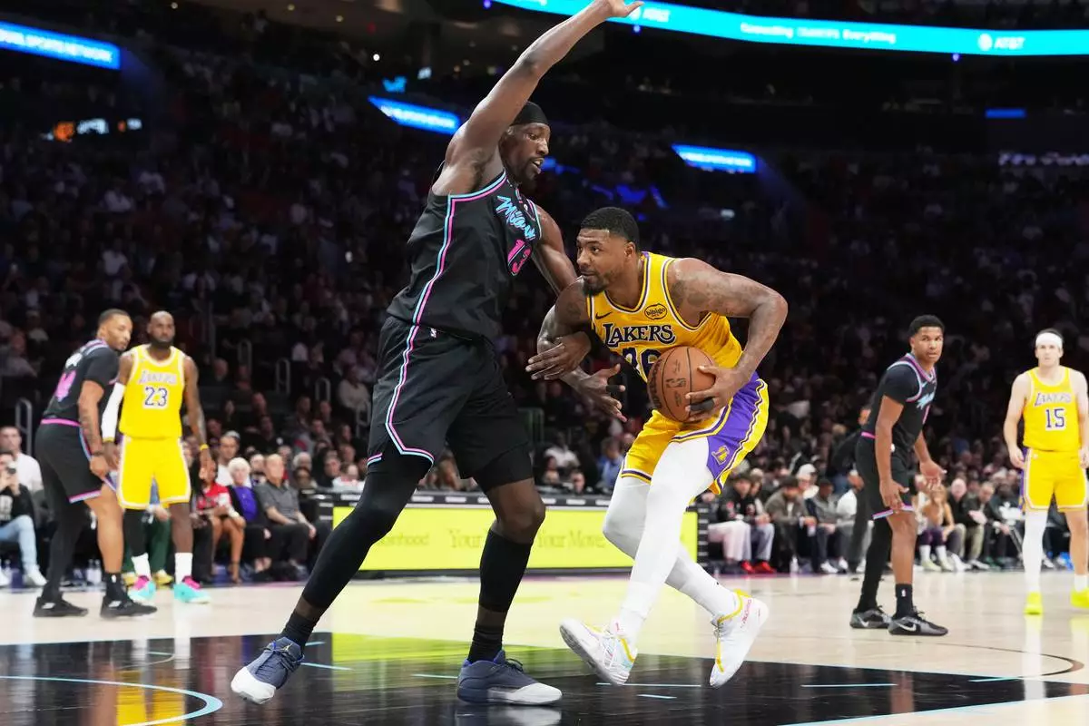 Los Angeles Lakers guard Marcus Smart, right, drives to the basket as Miami Heat center Bam Adebayo, left, defends during the first half of an NBA basketball game, Thursday, March 19, 2026, in Miami. (AP Photo/Lynne Sladky)