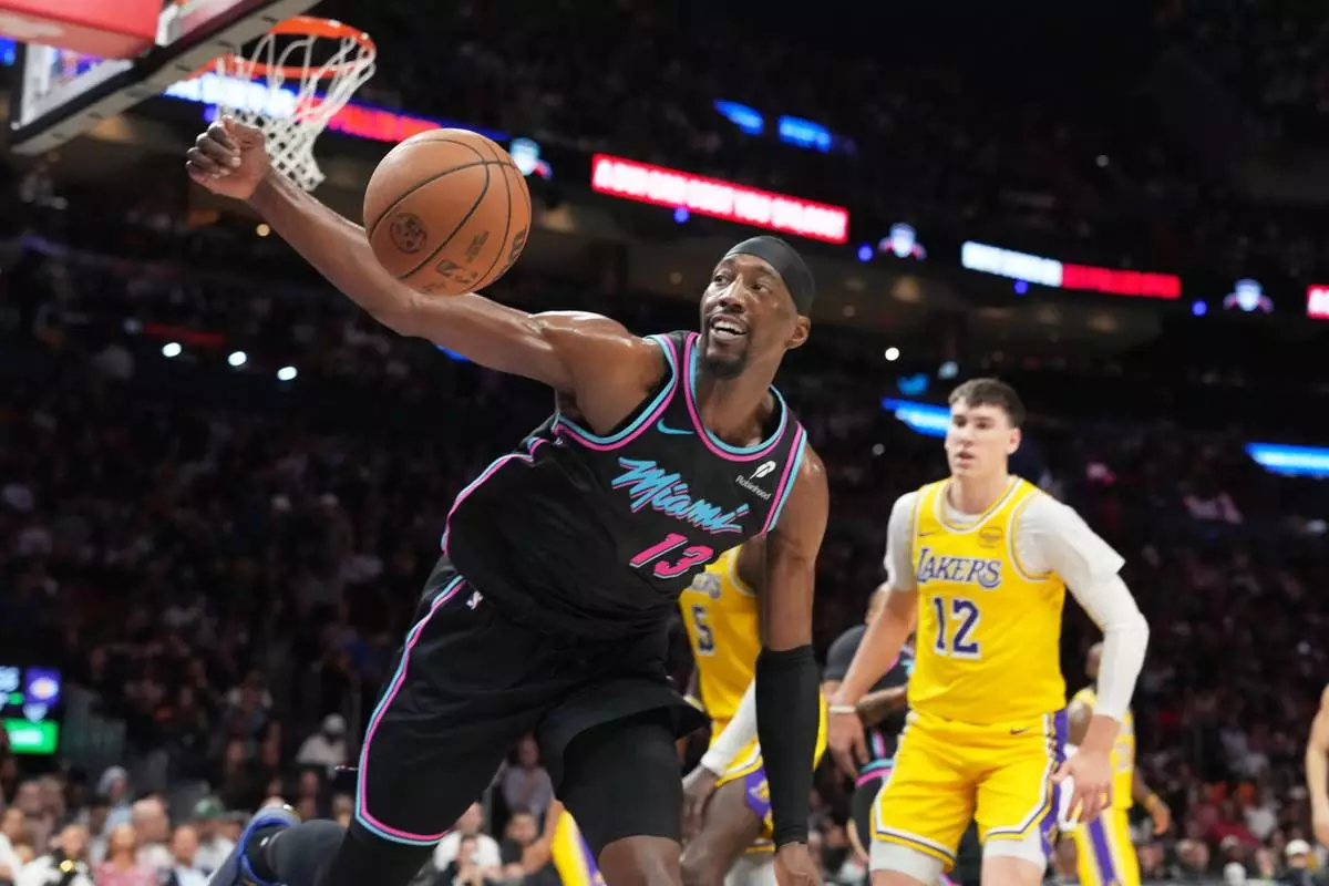 Miami Heat center Bam Adebayo (13) goes for a loose ball during the first half of an NBA basketball game against the Los Angeles Lakers, Thursday, March 19, 2026, in Miami. (AP Photo/Lynne Sladky)