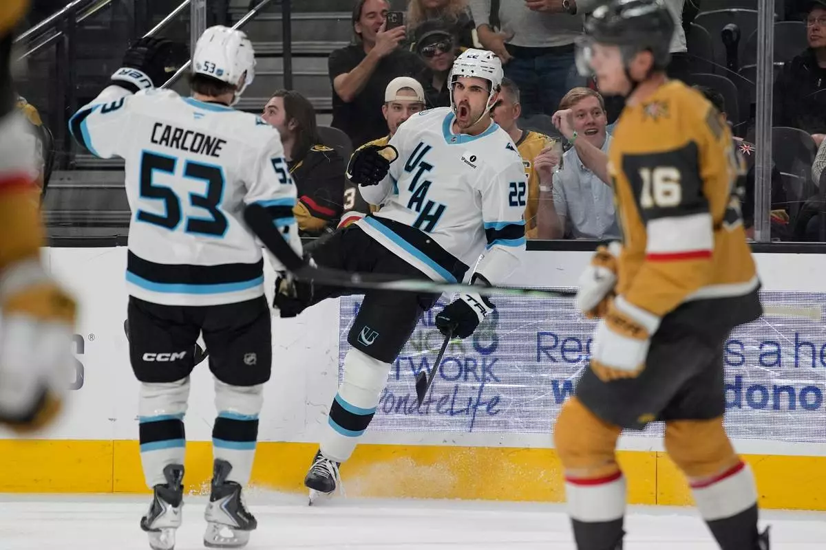 Utah Mammoth center Jack McBain (22) celebrates after scoring against the Vegas Golden Knights during the first period of an NHL hockey game Thursday, March 19, 2026, in Las Vegas. (AP Photo/John Locher)