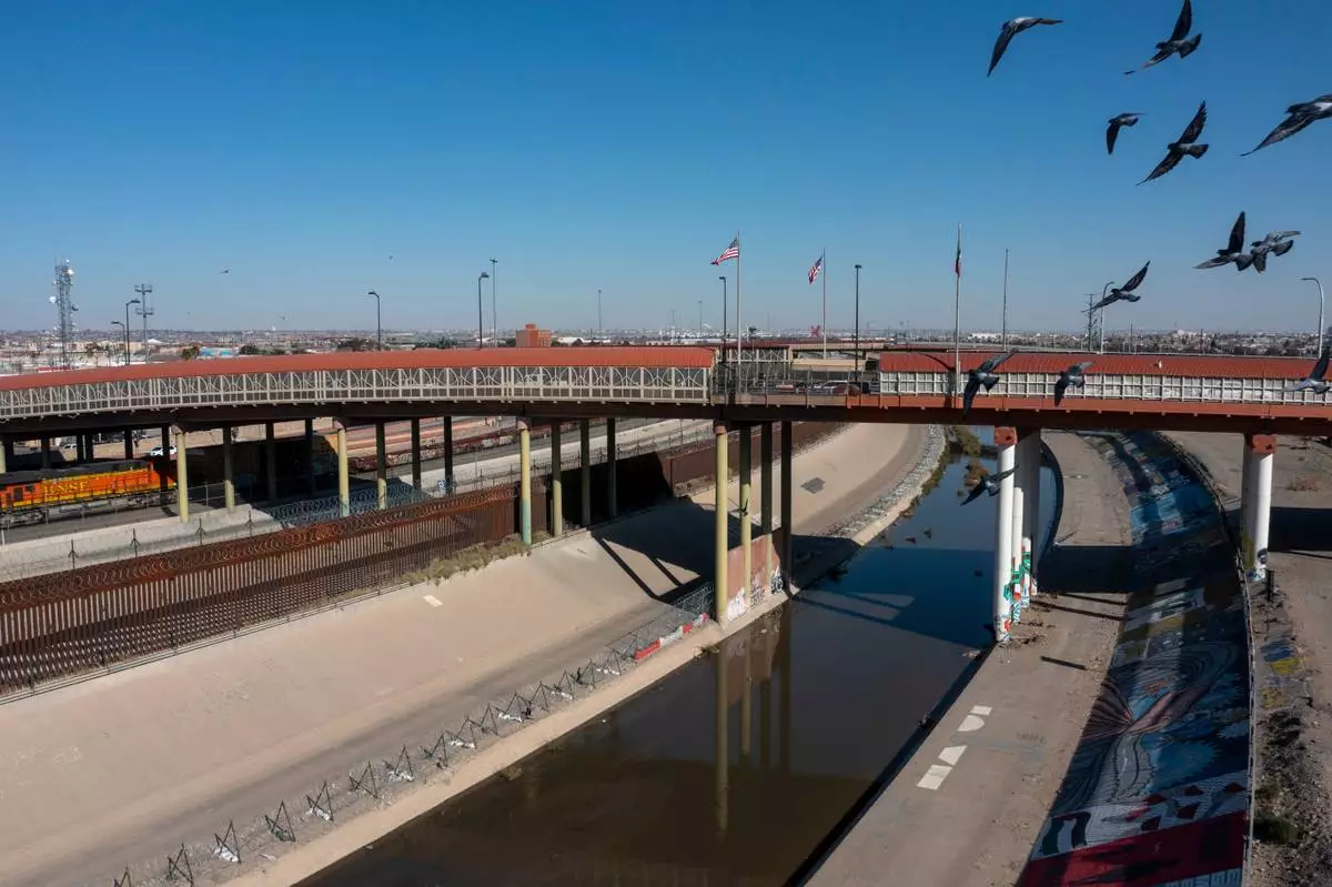 FILE - Pigeons fly over the Rio Grande river and the Paso del Norte bridge that connects Ciudad Juarez, Mexico, and El Paso, Texas, Jan. 19, 2025, in Ciudad Juarez, Mexico. (AP Photo/Andres Leighton, File)