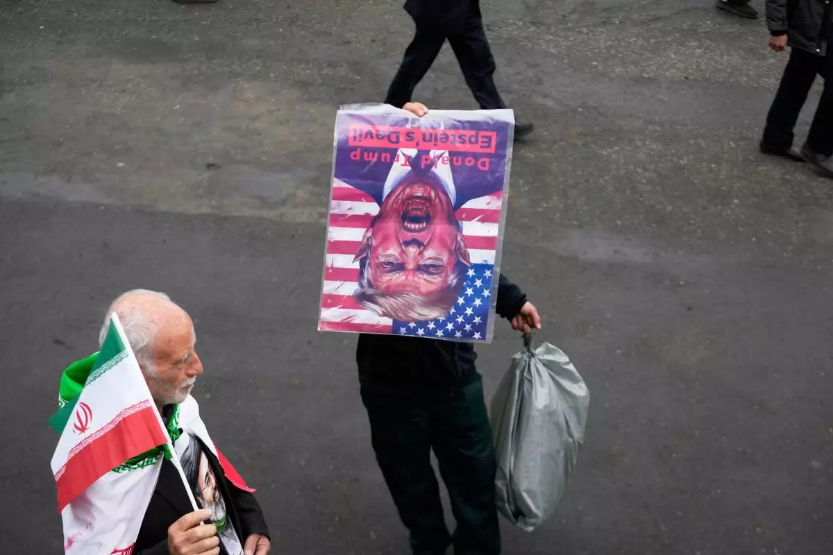 A man holds a picture of U.S. President Donald Trump upside down after Friday prayers at the Imam Khomeini Grand Mosque in Tehran, Iran, Friday, March 20, 2026. (AP Photo/Vahid Salemi)