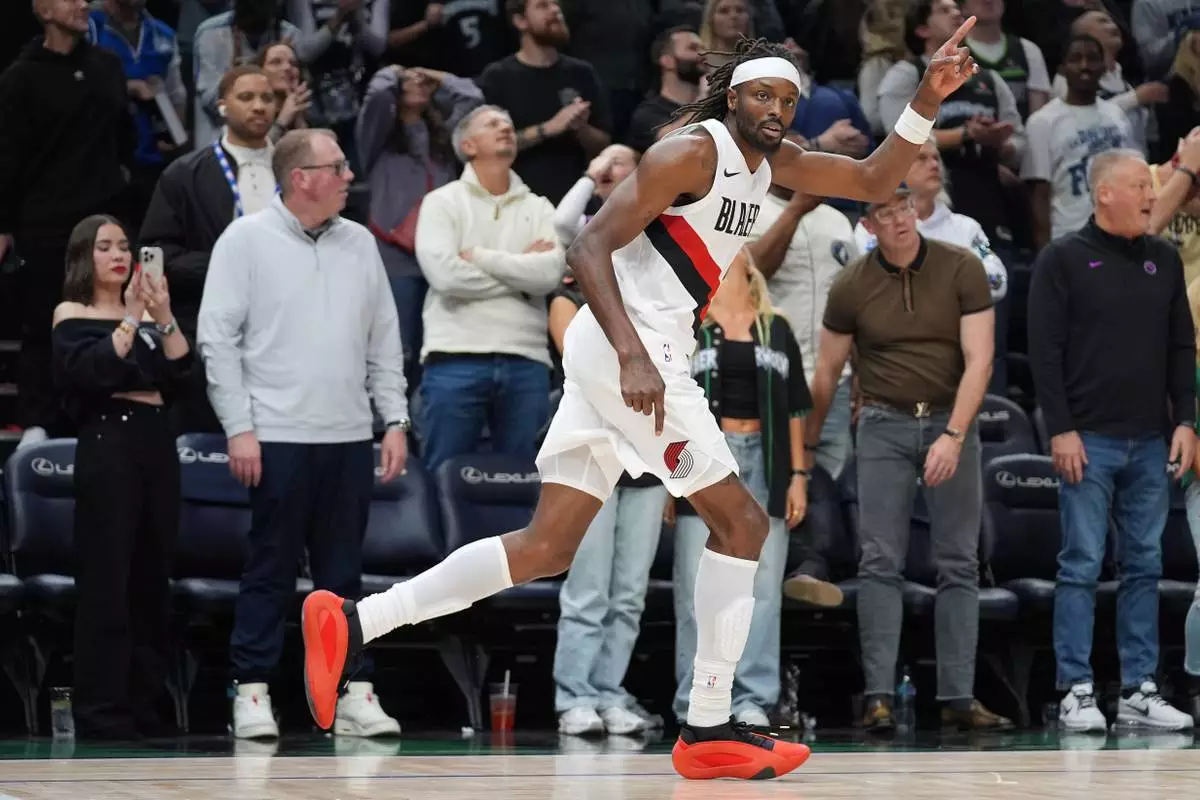 Portland Trail Blazers forward Jerami Grant (9) celebrates after making a 3-point shot during the second half of an NBA basketball game against the Minnesota Timberwolves, Friday, March 20, 2026, in Minneapolis. (AP Photo/Abbie Parr)