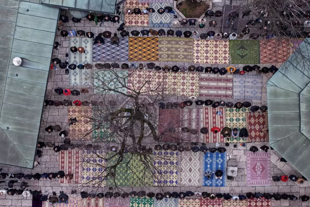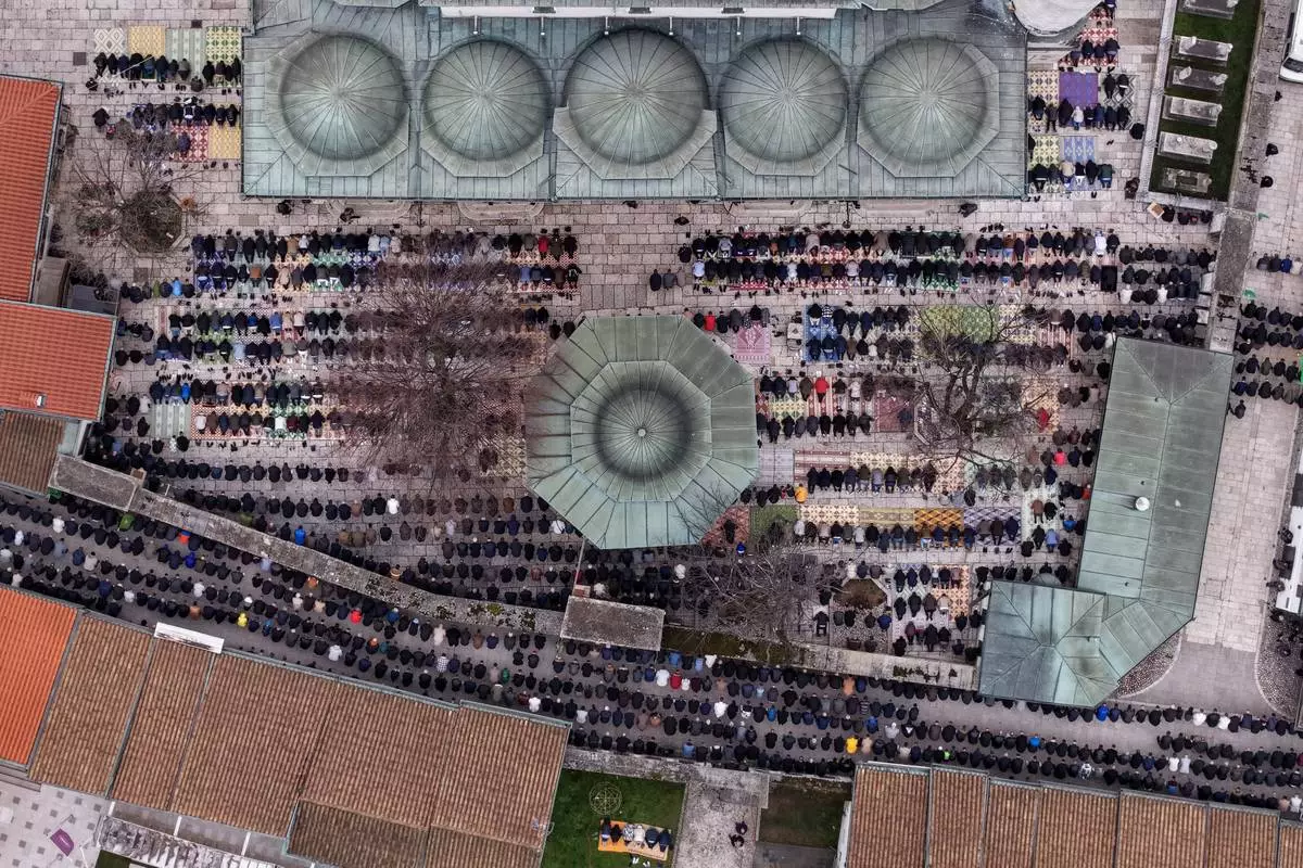 An aerial view of Bosnian Muslims praying during Eid al-Fitr, which marks the end of the holy fasting month of Ramadan in Gazi Husrev-beg Mosque in Sarajevo, Bosnia, Friday, March 20, 2026. (AP Photo/Armin Durgut)