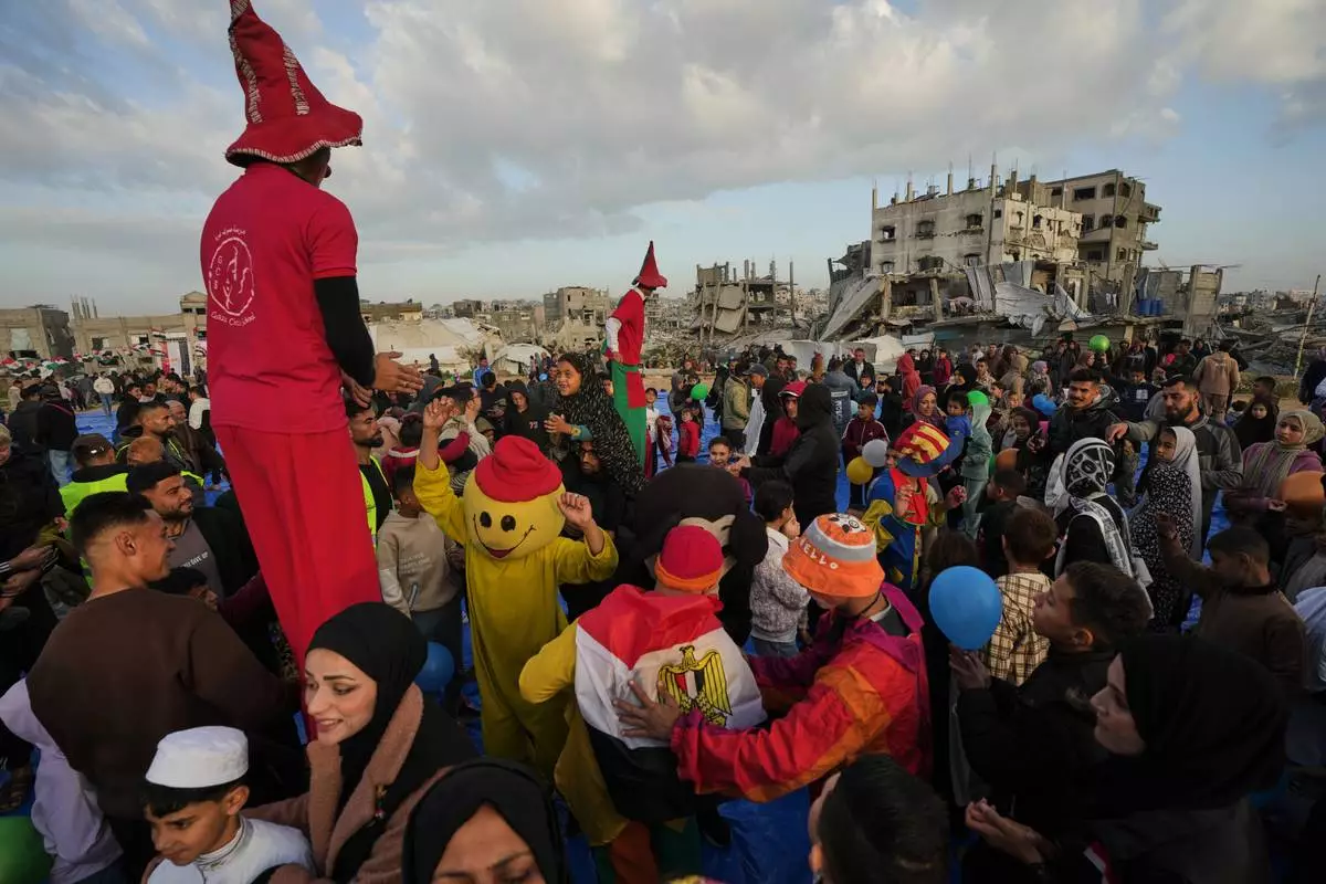 Palestinians celebrate Eid al-Fitr amid the rubble of destroyed buildings in Jabaliya, Gaza Strip, Friday, March 20, 2026. (AP Photo/Jehad Alshrafi)