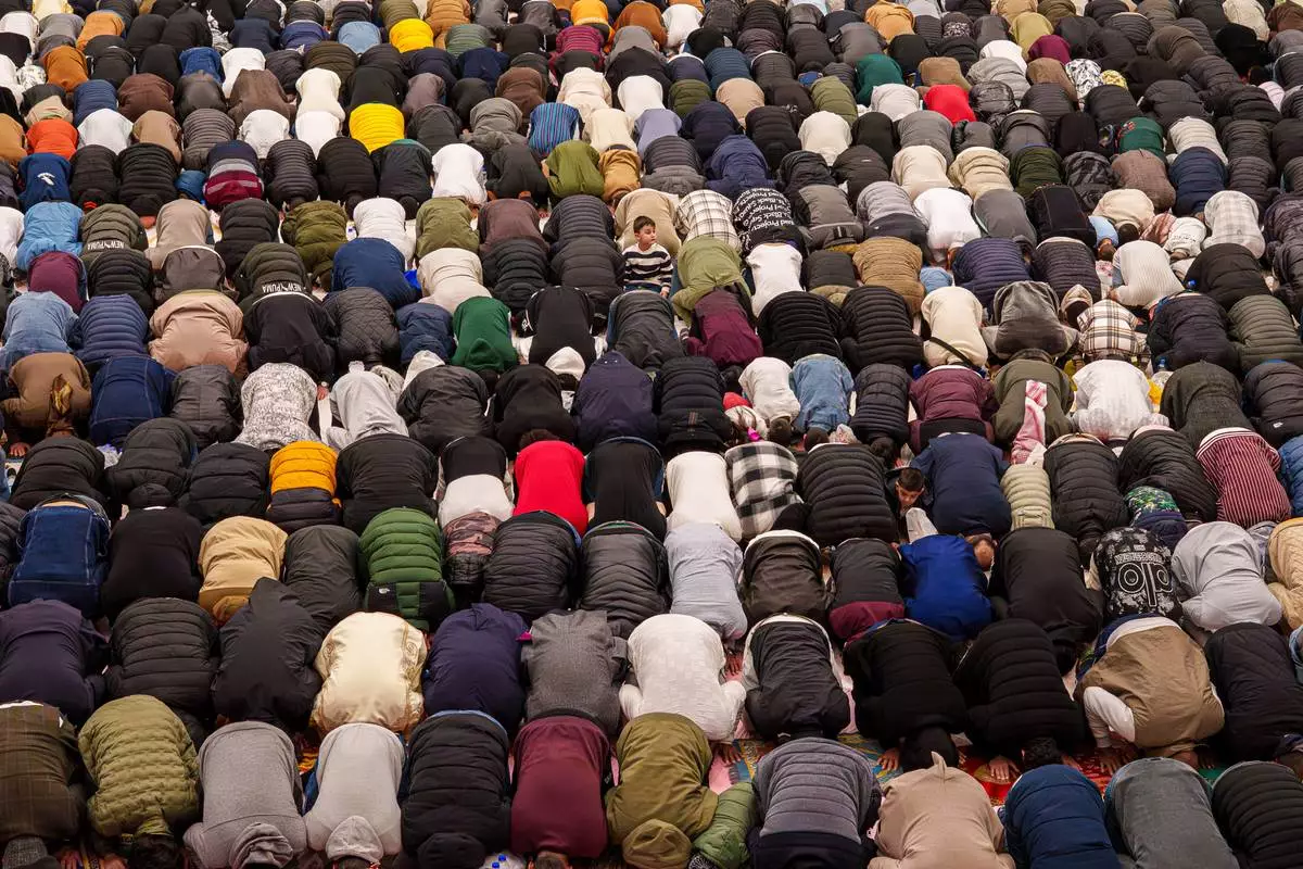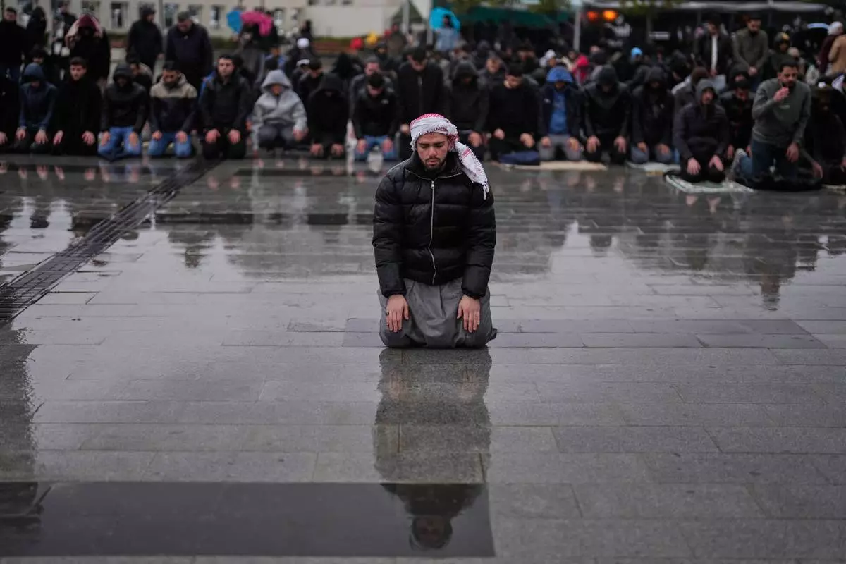 Muslim worshippers attend Eid al-Fitr prayers outside a mosque in Istanbul, Friday, March 20, 2026. (AP Photo/Khalil Hamra)