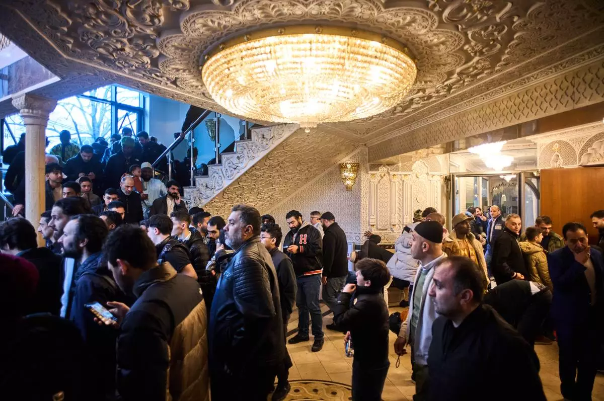 Muslims leave the Omar ibn al-Khattab Mosque after Eid al-Fitr prayers, the Muslim holiday marking the end of Ramadan, Islam's holy month of fasting, in Berlin, Germany, Friday, March 20, 2026. (AP Photo/Markus Schreiber)