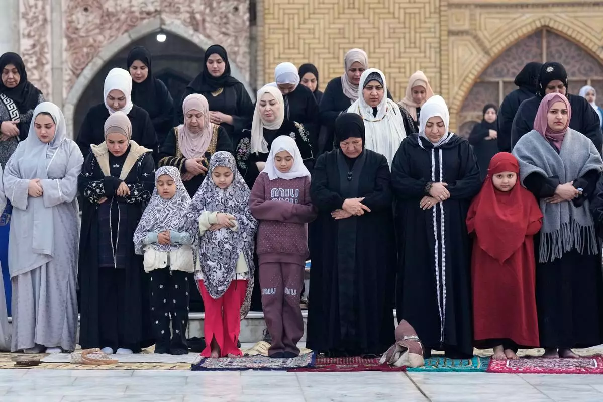 Muslims offer Eid al-Fitr prayers at the Abdul-Qadir al-Gailani mosque in Baghdad, Iraq, Friday, March 20, 2026. (AP Photo/Hadi Mizban)
