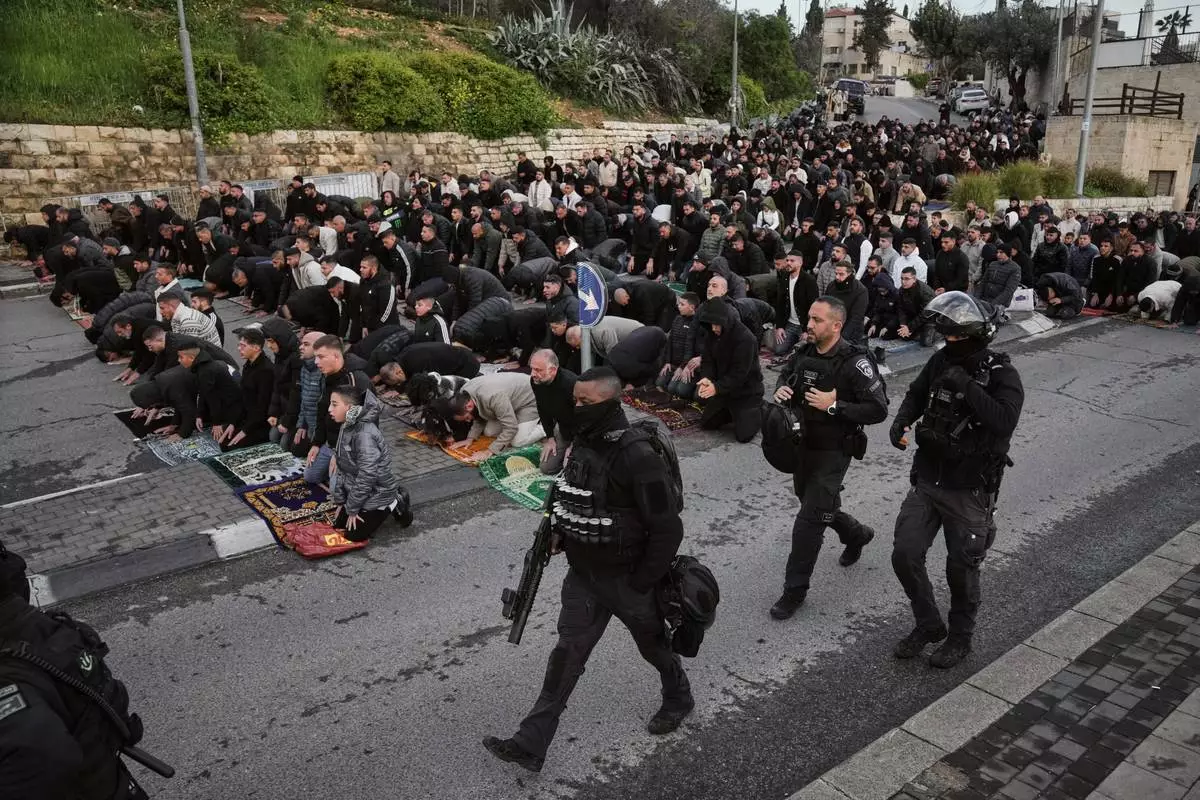 Israeli police officers pass by Palestinian Muslims as they offer Eid al-Fitr prayers in Jerusalem while the Old City remains closed to visitors under nationwide Home Front Command restrictions banning large gatherings amid the war with Iran, Friday, March 20, 2026. (AP Photo/Mahmoud Illean)