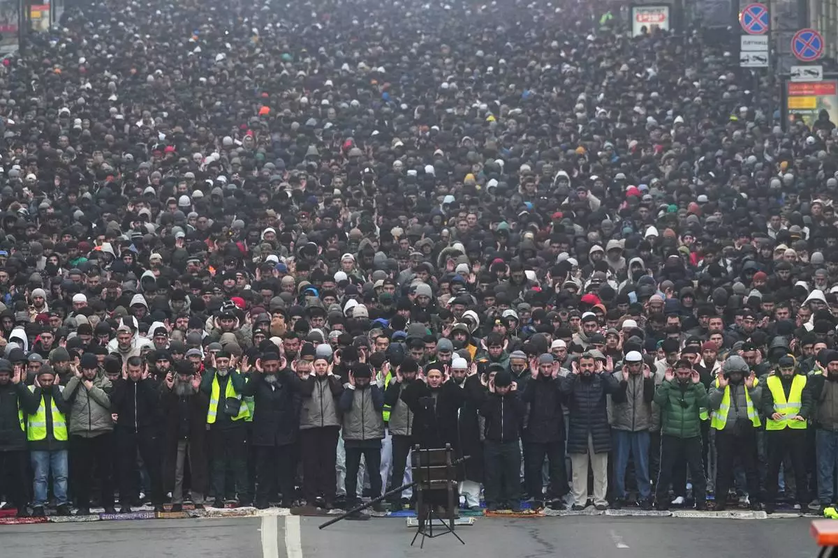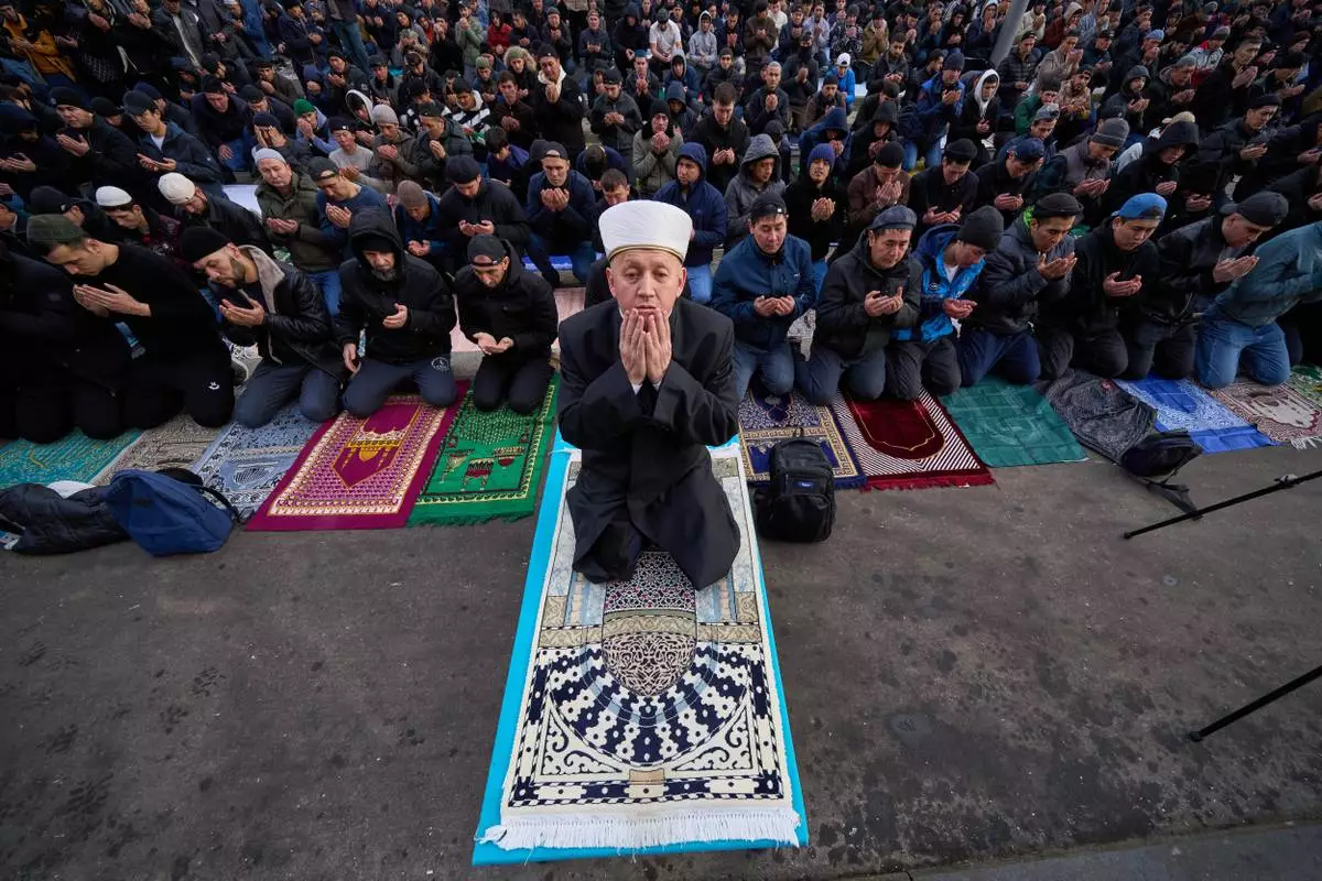 Muslims pray as they celebrate Eid al-Fitr, marking the end of the Muslims' holy fasting month of Ramadan, in St. Petersburg, Russia, Friday, March 20, 2026. (AP Photo/Dmitri Lovetsky)