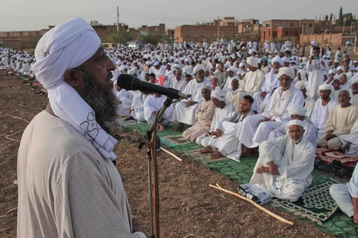 Sudanese gather for the Eid al-Fitr prayer, the Muslim holiday marking the end of Ramadan, Islam's holy month of fasting, in Khartoum, Sudan, Friday, March 20, 2026. (AP Photo/Marwan Ali)