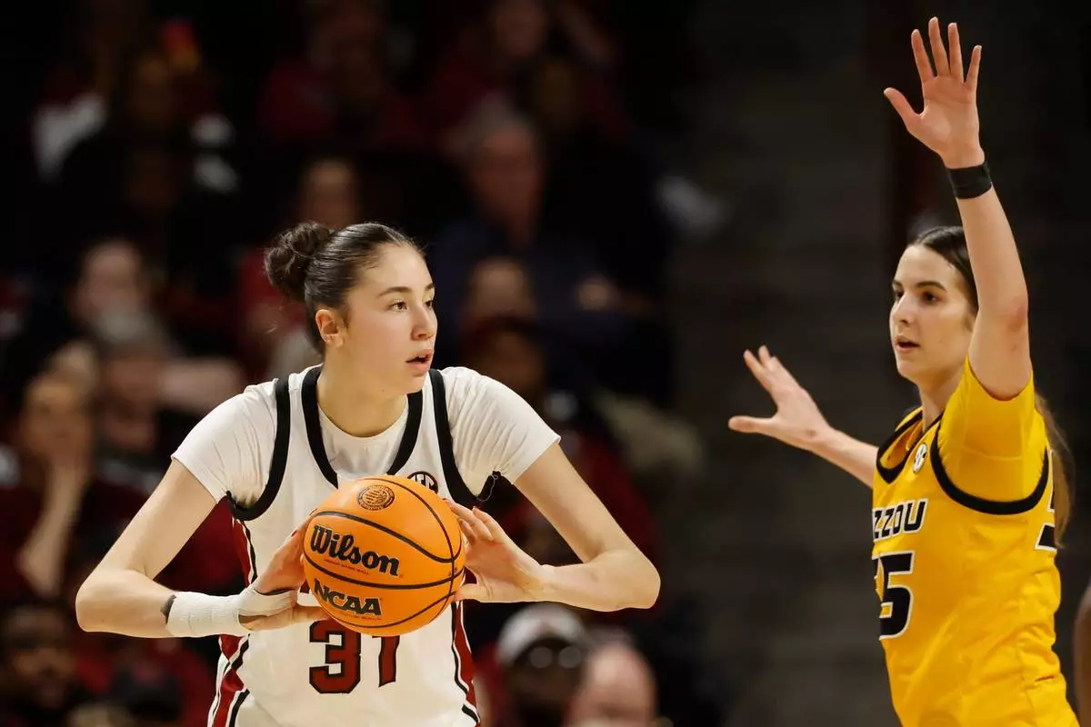 South Carolina forward Alicia Tournebize, left, looks to pass the ball against Missouri forward Reka Toman, right, during the second half of an NCAA college basketball game in Columbia, S.C., Thursday, Feb. 26, 2026. (AP Photo/Nell Redmond)