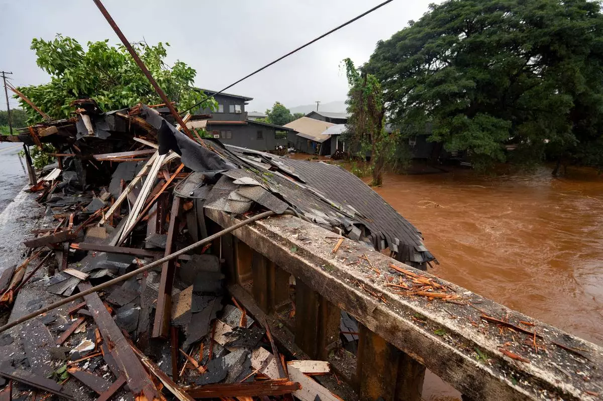 Debris from a storm-damaged house sits against a bridge along Kaukonahua Stream, caused by flooding from severe rains in Waialua, Hawaii, Friday, March 20, 2026. (AP Photo/Mengshin Lin)