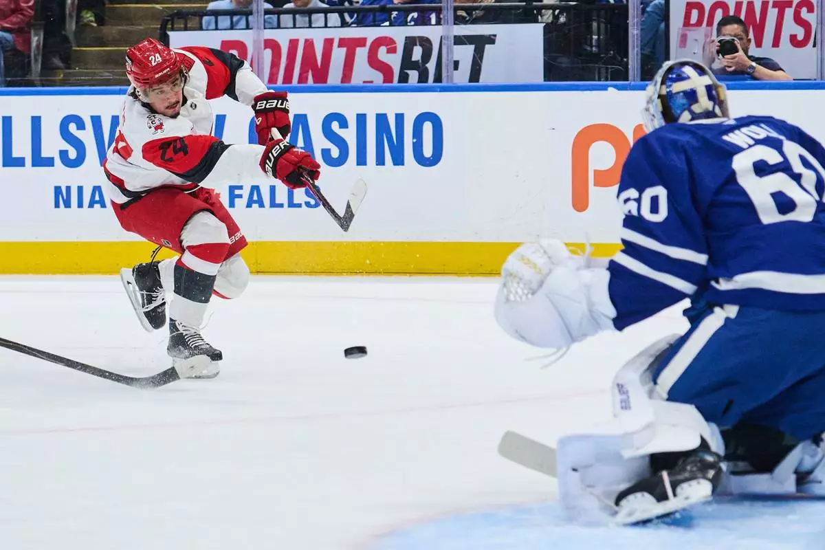 Carolina Hurricanes' Seth Jarvis (24) shoots against Toronto Maple Leafs goaltender Joseph Woll (60) during first-period NHL hockey game action in Toronto, Friday, March 20, 2026. (Sammy Kogan/The Canadian Press via AP)