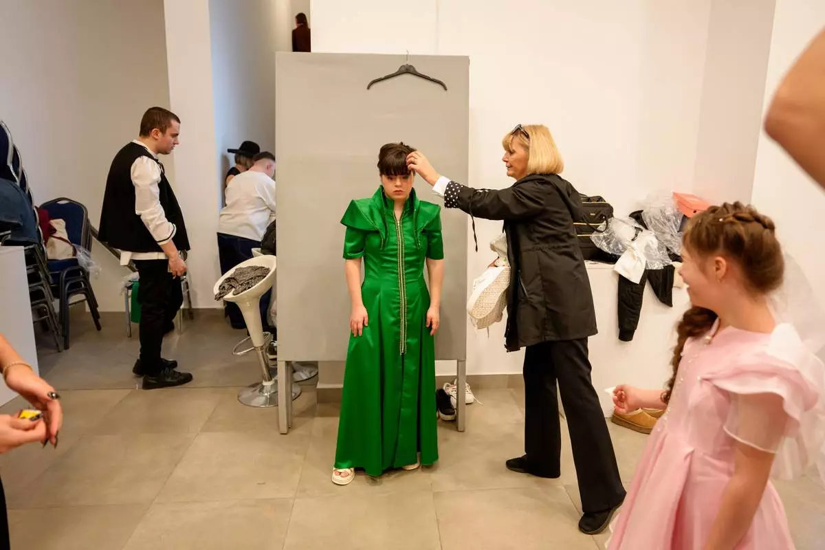 Marusika Burlaca sits while getting her hair done, before the SEEN Anonymous Seamstresses Gala, an event organised by the Down Plus Bucharest, an NGO supporting youngsters with Down Syndrome and other intellectual disabilities, in Bucharest, Romania, Wednesday, March 18, 2026, ahead of the World Down Syndrome Day, on March 21. (AP Photo/ Vadim Ghirda)