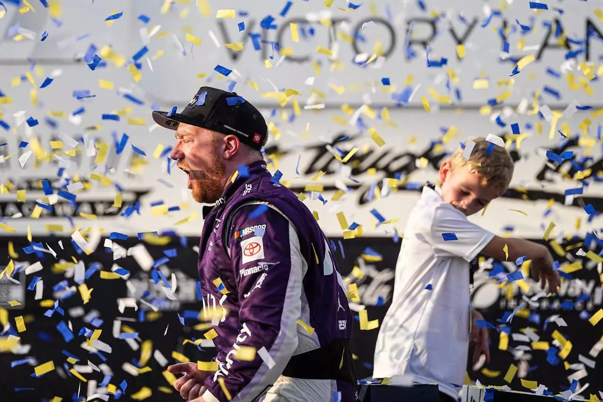 Tyler Reddick, center, celebrates in Victory Lane after winning a NASCAR Cup Series auto race, Sunday, March 22, 2026, in Darlington, S.C.(AP Photo/Matt Kelley)