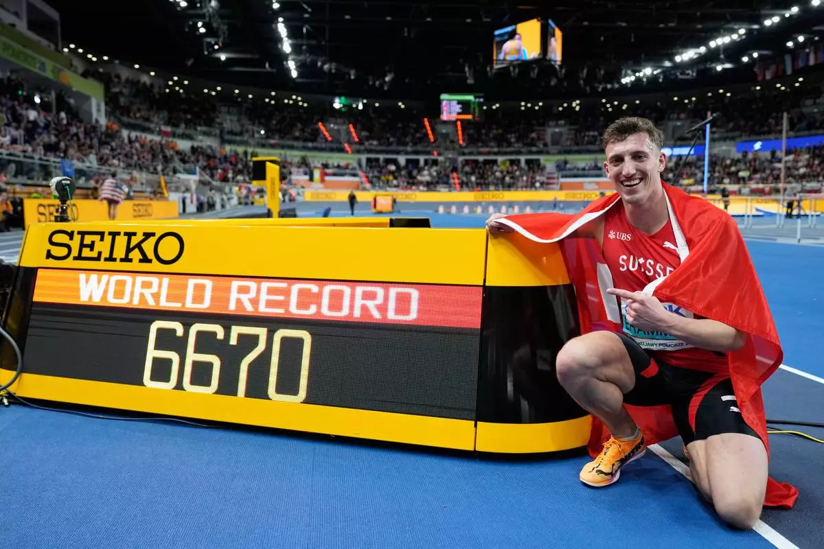 Simon Ehammer, of Switzerland, posesafter winning the gold medal and setting a new world record in the heptathlon at the World Athletics Indoor Championships in Torun, Poland, Saturday, March 21, 2026. (AP Photo/Matthias Schrader)