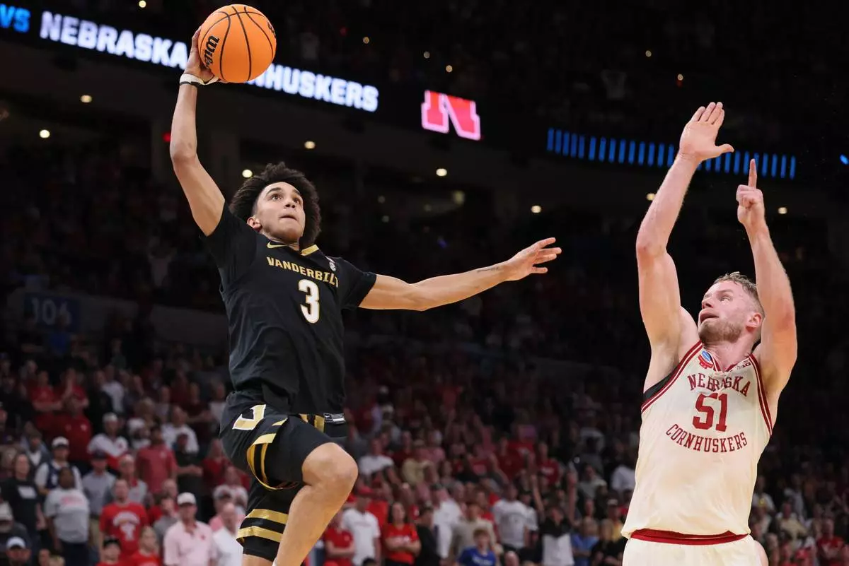 Vanderbilt guard Tyler Tanner (3) goes to the basket against Nebraska forward Rienk Mast (51) during the first half in the second round of the NCAA college basketball tournament, Saturday, March 21, 2026, in Oklahoma City. (AP Photo/Nate Billings)