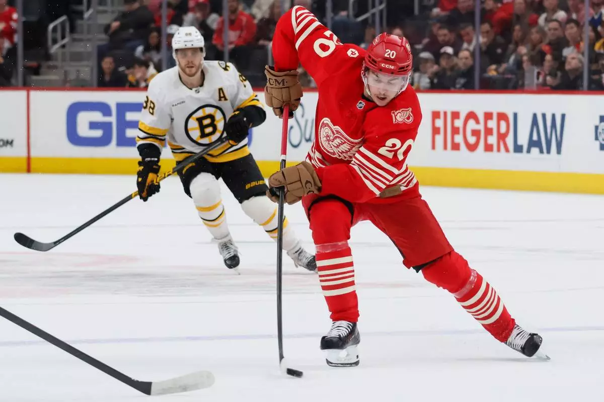 Detroit Red Wings defenseman Albert Johansson (20) is pursued by Boston Bruins right wing David Pastrnak (88) while skating toward the goal during the first period of an NHL hockey game Saturday, March 21, 2026, in Detroit. (AP Photo/Duane Burleson)